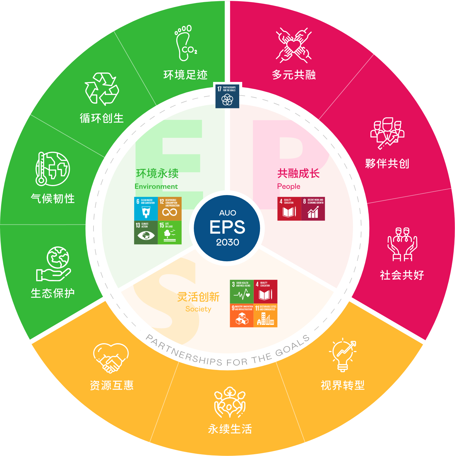 接轨联合国 SDGs 永续发展目标,友达光电以“超越企业社会责任,创造共享价值”为愿景,制定 EPS 三大永续发展主轴,并延伸订定具体目标引领行动,擘画企业永续策略路径。以 2018 至 2025 年的 EPS 实绩为基础,友达以 EPS 2030 展望未来,设立 30 项永续目标,持续推动企业永续实践。我们将持续致力于降低环境冲击与发展循环经济,深化社会正向影响力,并通过创新研发强化场域应用技术,开创人类生活全新可能。同时携手生态圈伙伴,共同迈向企业发展与地球永续的双赢局面。