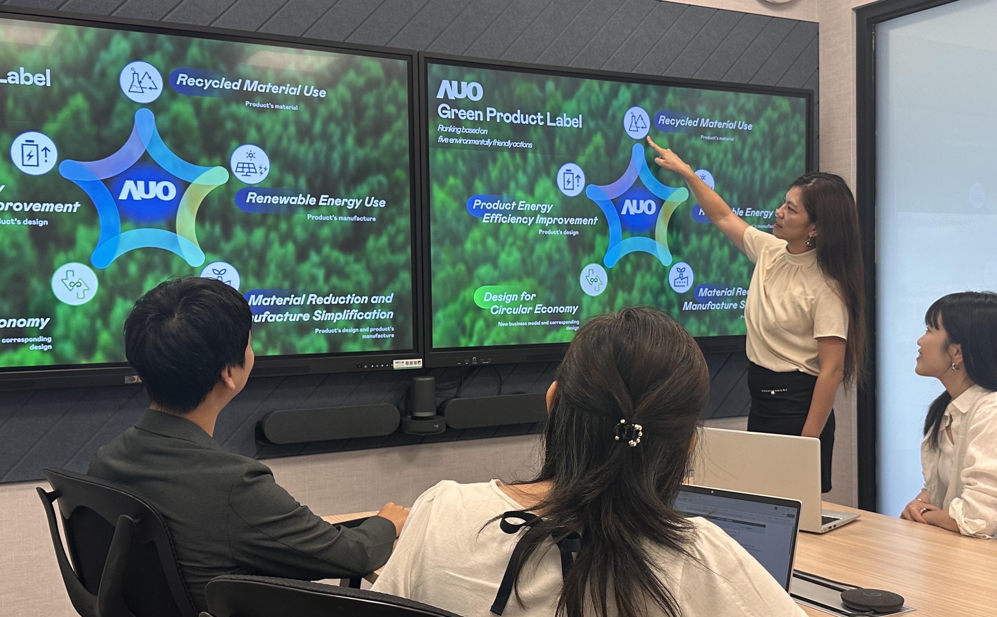 AUO "Green Label" covers five key indicators: Recycled Materials Use, Renewable Energy Use (in panel manufacturing), Product Energy Efficiency Improvement, Material Reduction and Manufacture Simplification, and Design for Circular Economy. These indicators not only increase the transparency of product sustainability information but also help brand clients clearly assess product environmental performance.